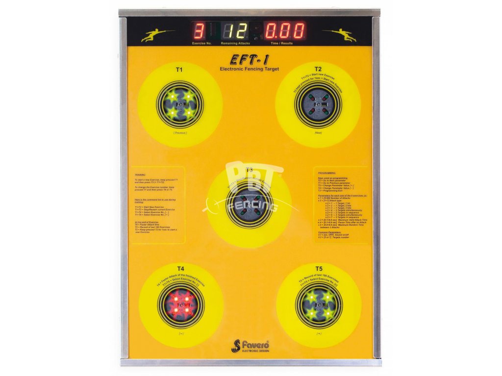 Elektronický tréninkový terč vč. napájení. 5 světelných terčů. Kompletně programovatelný, umožňuje nastavení typu zásahu (jeden, dva nebo tři zásahy jednoho rozsvíceného terče, zásah libovolného ze dvou nebo tří rozsvícených terčů, postupný zásah obou nebo všech tří rozsvícených terčů), nastavení požadovaného počtu zásahů během cvičení (od 3 do 99), časového limitu na zásah a pauzy mezi zásahy (včetně možnosti náhodně dlouhé prodlevy).