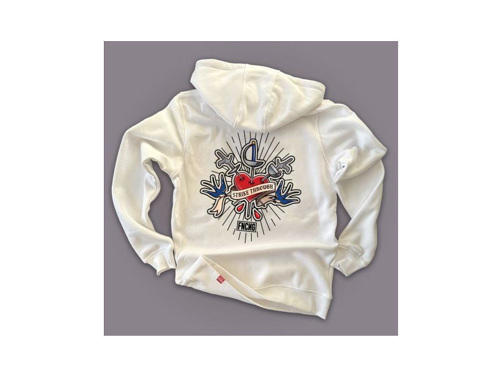 Mikina "Skrz na skrz" kombinuje čistotu bílé s ostrým symbolem – červené srdce probodnuté přesně jako zásah na čas. Street art, tetovací estetika a šerm v jednom.